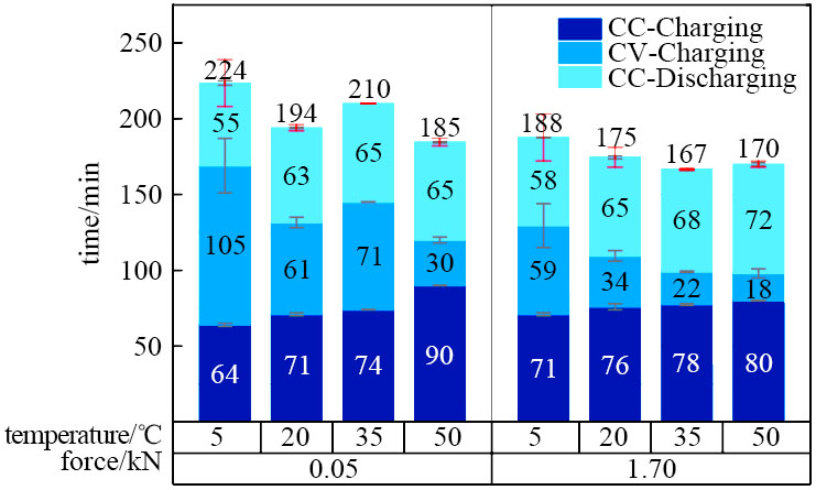 鋰離子電池施加外部機械壓力在已有文獻報道中優(yōu)劣勢并存。優(yōu)勢包括更好的電極接觸,更少的鋰沉積,更少的氣體產(chǎn)生和分布。劣勢包括較低機械壓力導(dǎo)致石墨膨脹的可能性和較高壓力下隔膜不均勻孔閉合導(dǎo)致的變形,阻礙電池內(nèi)部動力學(xué)。Heimes等通過包含恒流充電-恒壓充電-恒流放電的化成程序中,設(shè)置了不同壓力和不同溫度,探究3個階段所需時間,結(jié)果如圖2所示。當外部機械壓力從0.05 kN增加到1.70 kN時,恒壓充電階段時間明顯降低,而恒流充放電階段時間并沒有太大差距,整個過程通過增加外部機械壓力能節(jié)約14.7%的化成時間。文章同時證明了高外部機械壓力比高環(huán)境溫度能更有潛力地降低電池化成時間,因此節(jié)省電池成本的可能性也更大。另外,當高溫和高機械壓力結(jié)合時,電池溫度升高,能夠抑制電池放熱反應(yīng)。