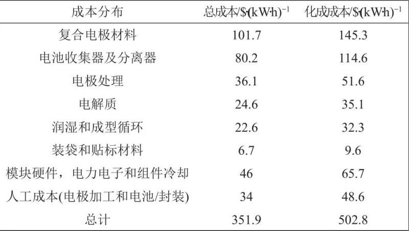 表1 鋰離子電池針對基本的電極加工情況對應(yīng)的成本分布(估價每千瓦時可用能量假設(shè)為70%的循環(huán)放電深度)