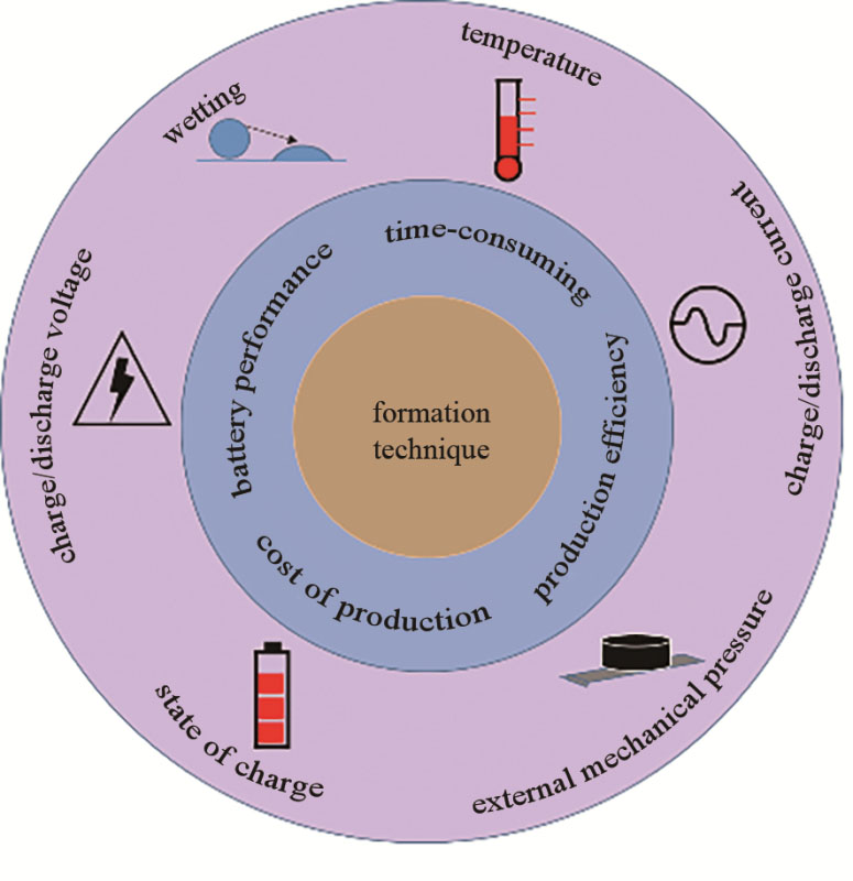 (5)發(fā)展方向則需實現(xiàn)化成的多因素(溫度、外部機械壓力、充放電電流等)可控,如進一步提高溫度,縮短化成時間,同時結(jié)合有效電解液添加劑外加新型化成方法,協(xié)同構(gòu)筑優(yōu)良的SEI保護層,提高化成效率。