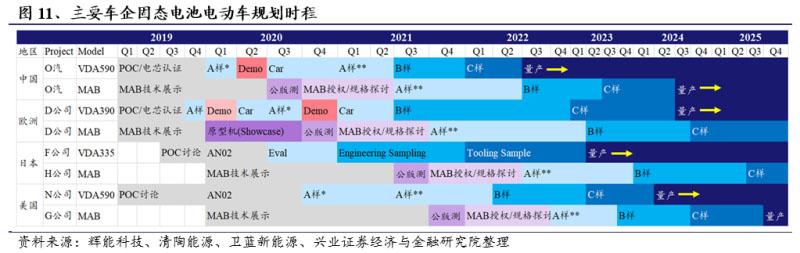 根據(jù)主要車企的規(guī)劃,搭載固態(tài)電池的產(chǎn)品預計最早于2022年以后量產(chǎn)。