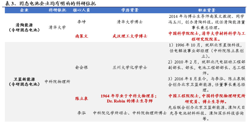產(chǎn)-研融合屬性突出。清陶能源、衛(wèi)藍新能源、浙江鋒鋰、新宙邦、QuantumScape等企業(yè)的核心技術(shù)人員均來自清華大學、中科院、南科大、斯坦福等頂尖科研院所。