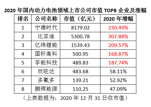 值得注意的是,寧德時代的市值增幅并不是最高的,在電池產業(yè)鏈領域,比亞迪2020年市值增長了307.88%,也是創(chuàng)下新高。同樣,在2020年,億緯鋰能、國軒高科、孚能科技等中國動力電池頭部企業(yè)的市值增幅也均超過一倍。