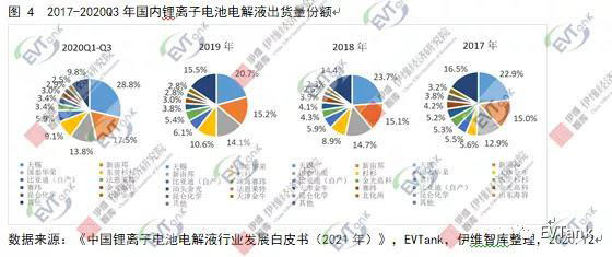 電解液的核心壁壘是保供能力,頭部企業(yè)憑借規(guī)模、成本、研發(fā)能力等優(yōu)勢(shì),市場(chǎng)份額持續(xù)增長(zhǎng),行業(yè)集中度進(jìn)一步提升,2017年-2020Q3前四名企業(yè)合計(jì)市占率分別為56.4%、62.4%、60.6%和69.1%。2020Q3前十名企業(yè)合計(jì)市占率超過90%,龍頭企業(yè)不同產(chǎn)品分配較均衡,市場(chǎng)格局基本穩(wěn)定,其中天賜材料憑借其產(chǎn)業(yè)鏈布局完善、成本控制能力強(qiáng)、定制化能力突出及客戶壁壘較高等優(yōu)勢(shì),龍頭地位穩(wěn)固;新宙邦、國(guó)泰華容、杉杉等第一梯隊(duì)企業(yè)增量明顯;比亞迪、法恩萊特、珠海賽緯和金光高科等第二梯隊(duì)企業(yè)市場(chǎng)份額也在逐步提升。具體來看,天賜材料穩(wěn)居第一,市場(chǎng)份額達(dá)到 28.8%;新宙邦排名第二,市場(chǎng)份額為 17.5%;國(guó)泰華榮排名第三,市場(chǎng)份額為 13.8%;東莞杉杉排名第四,市場(chǎng)份額為9.1%。