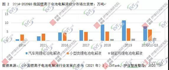 電解液屬于鋰電四大材料之一,是鋰離子電池的血液,在保障鋰離子電池的安全性、長(zhǎng)循環(huán)等性能方面至關(guān)重要。目前,電解液已基本實(shí)現(xiàn)國(guó)產(chǎn)化,其出貨量與鋰離子電池出貨量成正比。2020年初受疫情影響,鋰電池需求低迷、開工率低,隨著二季度國(guó)內(nèi)疫情控制后有序復(fù)工復(fù)產(chǎn),國(guó)內(nèi)經(jīng)濟(jì)復(fù)蘇超預(yù)期,鋰電池需求增長(zhǎng)帶動(dòng)電解液出貨量回升,截止2020Q3,我國(guó)鋰離子電池電解液出貨量為16.1萬噸,近六年年均增長(zhǎng)速度為34.5%,其中,汽車用動(dòng)力電池電解液出貨量為8.2萬噸,小型類鋰離子電池電解液出貨量為6.3萬噸,儲(chǔ)能用鋰離子電池電解液出貨量為1.6萬噸。