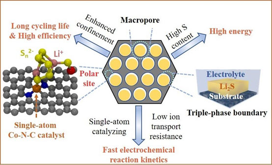 為了解決上述問題,Zhao教授團(tuán)隊(duì)與國際研究人員合作,提出了一種陰極設(shè)計(jì)概念,可以實(shí)現(xiàn)良好的鋰硫電池性能。研究人員將硫均勻地嵌入到高度定向的大孔中,同時(shí)該大孔內(nèi)部嵌有豐富分活性位點(diǎn),以緊緊地吸附多硫化物,消除穿梭效應(yīng)以及鋰金屬腐蝕影響。通過為鋰硫電池提出新型硫陰極設(shè)計(jì)原則,該聯(lián)合小組提升了該電池的能量密度,并為實(shí)現(xiàn)該電池的工業(yè)化邁進(jìn)了一大步。