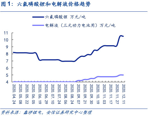 六氟磷酸鋰短期內(nèi)價(jià)格已底部上行。在下半年新能源車需求端顯著回暖和電解液的需求大幅度增長的情況下,帶動了六氟磷酸鋰需求增長,疊加原材料碳酸鋰價(jià)格上探,推動六氟磷酸鋰企業(yè)議價(jià)權(quán)增加。在此基礎(chǔ)上,六氟磷酸鋰短期價(jià)格已實(shí)現(xiàn)底部上行。根據(jù)鑫欏鋰電,目前圣誕節(jié)前后六氟磷酸鋰的市場價(jià)格已經(jīng)增長到了11萬元/噸。