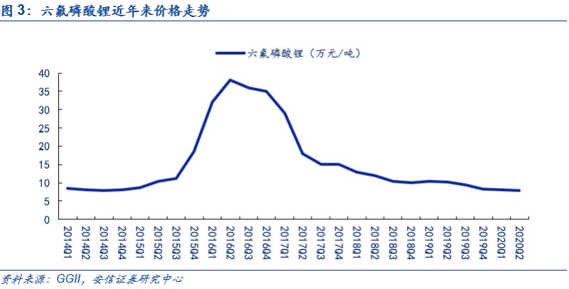 回顧過往,六氟磷酸鋰價(jià)格周期性明顯,2020年上半年仍處在價(jià)格底部。自2011年六氟磷酸鋰實(shí)現(xiàn)國產(chǎn)化后,由于第一輪擴(kuò)產(chǎn),疊加需求尚未大規(guī)模啟動,導(dǎo)致供過于求,價(jià)格長期低于10萬元/噸;2015年以來新能源車的發(fā)展帶動六氟磷酸鋰需求大增,短期內(nèi)新增產(chǎn)能無法彌補(bǔ)高速增長的需求,根據(jù)GGII數(shù)據(jù),價(jià)格由2015年第三季度的10萬元/噸上漲至2016年二季度的38萬元/噸,漲幅高達(dá)280%;但在此后,由于需求端漲幅縮窄,疊加供給端新產(chǎn)能投放,到2017年第四季度,六氟磷酸鋰價(jià)格快速下滑,跌至15萬元/噸;進(jìn)入2018年后,價(jià)格下滑速度放緩,進(jìn)入9.5-11萬元/噸的區(qū)間;由于2019年新能源汽車銷量和2018年持平,六氟磷酸鋰的需求沒有增長,而此前新投產(chǎn)產(chǎn)能過多,行業(yè)仍然供大于求,疊加主要原材料碳酸鋰價(jià)格持續(xù)下跌,六氟磷酸鋰價(jià)格仍處于陰跌的通道中,到2020年8月份,六氟磷酸鋰行業(yè)價(jià)格最低處于均價(jià)不到7萬元/噸,處于歷史價(jià)格底部。