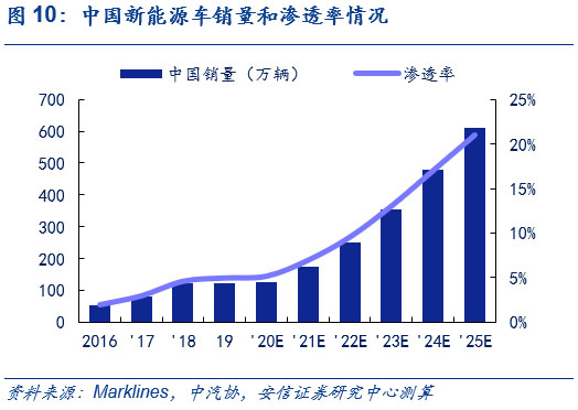 中國方面,產(chǎn)品驅(qū)動推動中國新能源車市場,2025年銷售量將超600萬輛,6年CAGR達(dá)31%。目前,中國市場正從政策驅(qū)動逐步轉(zhuǎn)向產(chǎn)品驅(qū)動,結(jié)合Marklines和中汽協(xié)的相關(guān)預(yù)測,考慮到大眾、奔馳和通用為首的傳統(tǒng)車企平臺化車型持續(xù)布局、造車新勢力顛覆傳統(tǒng)的產(chǎn)品驅(qū)動力持續(xù)發(fā)酵和特斯拉Model Y等產(chǎn)品在未來的潛在爆款效應(yīng),以2019年為基年,我們預(yù)計(jì)中國今年全年新能源車銷量約125萬輛;明年銷量近180萬輛,同比增長超40%;2025年達(dá)611萬輛,6年CAGR達(dá)31%,2025年新能源車滲透率超20%,測算過程可參見此前外發(fā)周報(bào)《歐洲電車逆勢增長超預(yù)期,中國產(chǎn)品力驅(qū)動持續(xù)凸顯》。