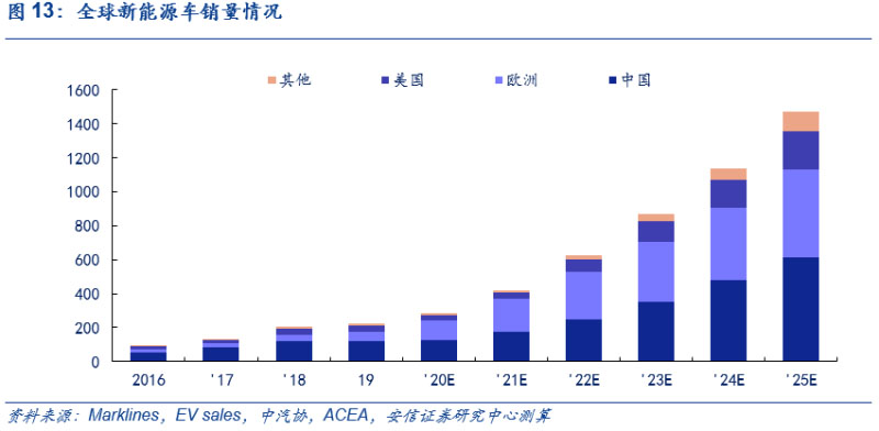 主要市場引領(lǐng)下,電動化大勢所趨,2025年全球新能源車銷售量近1500萬輛,6年CAGR達(dá)37%。目前,全球新能源車在中國、歐洲和美國為首的市場高速發(fā)展,未來五年,在不同國家多因素驅(qū)動的背景下,結(jié)合此前我們對中歐等地區(qū)的預(yù)測,以2019年為基年,我們預(yù)計(jì)全球2025年新能源車銷量達(dá)1468萬輛,6年CAGR達(dá)37%,2025年新能源車滲透率超15%,測算過程可參見此前外發(fā)周報(bào)《歐洲電車逆勢增長超預(yù)期,中國產(chǎn)品力驅(qū)動持續(xù)凸顯》。