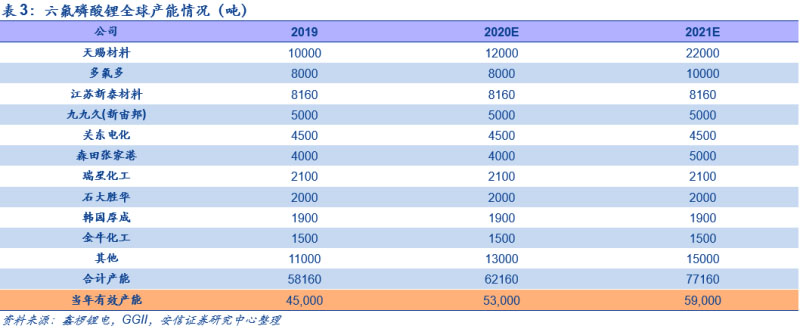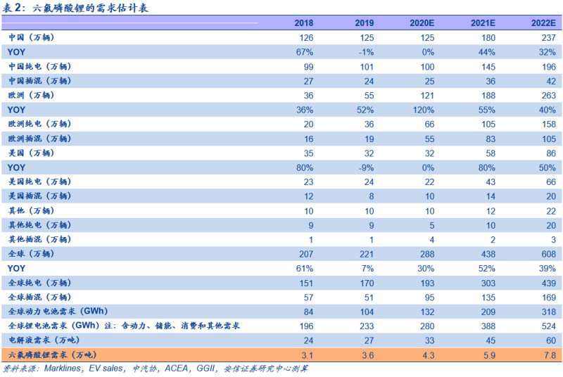 供需缺口疊加成本推動,漲價(jià)在中期仍具有持續(xù)性:從中長期來看,需求端,全球新能源車在中國、歐洲和美國為首的市場高速發(fā)展,未來五年,在不同國家多因素驅(qū)動的背景下,以2019年為基年,我們預(yù)計(jì)全球2025年新能源車銷量達(dá)1468萬輛,6年CAGR達(dá)37%,2025年新能源車滲透率超15%,在此基礎(chǔ)上,我們測算明后年六氟磷酸鋰需求分別為5.9/7.8萬噸,同比分別增長38%/33%。供給端,2020-2022年預(yù)計(jì)形成六氟磷酸鋰名義產(chǎn)能6.3/7.8/9.7萬噸。但由于投產(chǎn)時(shí)間點(diǎn)不同及產(chǎn)能爬坡有一定周期,且原有產(chǎn)能有部分為老產(chǎn)線,有化工檢修等方面的需要,疊加部分小廠在虧損情況下關(guān)停產(chǎn)線,從目前來看,預(yù)計(jì)2020-2022年有效產(chǎn)能分別為5.3/5.9/7.2萬噸,中期新增供給有限,緊平衡格局將持續(xù),相關(guān)六氟磷酸鋰廠商產(chǎn)能利用率將持續(xù)上行。成本端,碳酸鋰、五氯化磷和無水氫氟酸在六氟磷酸鋰的成本中的占比較大,隨著下游需求景氣疊加冬季原料供應(yīng)偏緊,短期內(nèi)碳酸鋰和無水氫氟酸價(jià)格均底部上行。而從中長期來看,澳洲部分礦產(chǎn)停產(chǎn)疊加南美鹽湖的擴(kuò)產(chǎn)因?yàn)橐咔檠雍蟮确矫娴囊蛩?,鋰礦新增產(chǎn)能釋放高峰期已過將帶來碳酸鋰價(jià)格的持續(xù)上漲,為六氟磷酸鋰的價(jià)格上漲提供支撐。