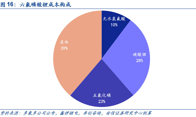 從成本構(gòu)成來看,碳酸鋰、五氯化磷和無水氫氟酸在成本中的占比較大。從六氟磷酸鋰的成本構(gòu)成來看,以多氟多披露數(shù)據(jù)為例來進(jìn)行測算,目前六氟磷酸鋰的單噸使用量中碳酸鋰、五氯化磷和無水氫氟酸分別為0.3/1.4/0.7噸,結(jié)合鑫欏鋰電,卓創(chuàng)咨詢相關(guān)產(chǎn)品價(jià)格,我們得到碳酸鋰、五氯化磷和無水氫氟酸在六氟磷酸鋰中的成本構(gòu)成分別為28%、23%和10%,占比較高。