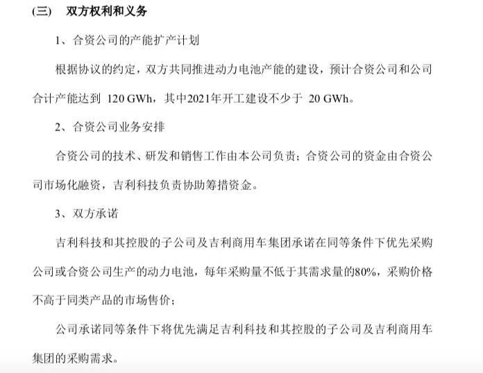 2018年12月,浙江吉潤與寧德時代簽署合資經(jīng)營合同,雙方共同出資設立合資公司。該合資公司注冊資本為10億元,浙江吉潤出資金額為4.9億元,出資比例為49%。不過,浙江吉潤與寧德時代的協(xié)議,僅僅說了會一起生產(chǎn)電池。