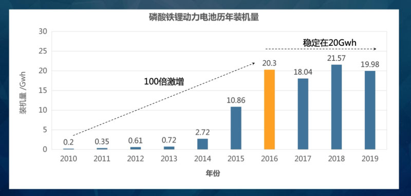 回望磷酸鐵鋰電池在國內(nèi)的發(fā)展,從裝機(jī)量來看,從2010年的0.2GWh到2016年的20.3GWh,其實現(xiàn)了7年100倍的激增。到2016年之后,穩(wěn)定在每年20GWh的狀態(tài)。