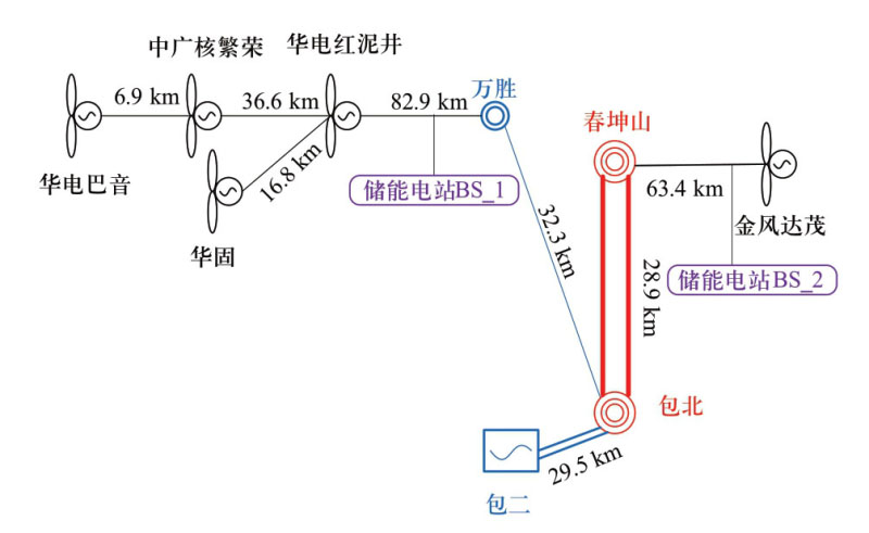 由于風(fēng)電場之間地理和電氣距離較遠(yuǎn),單個(gè)儲能發(fā)電單元或電站建立的電源在經(jīng)過不同變電站間多次電壓變換后,可能會因線路和變電設(shè)備的損耗大或動態(tài)無功調(diào)節(jié)要求高,使得風(fēng)電機(jī)組難以可靠啟動,因此需分析儲能選址。多儲能系統(tǒng)協(xié)同風(fēng)電系統(tǒng)作為黑啟動電源參與黑啟動,恢復(fù)供電。