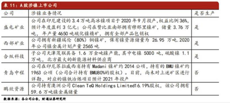據(jù)財(cái)通證券李帥華9月28日報(bào)告整理,A股涉鎳上市公司有:盛屯礦業(yè)、西部礦業(yè)、合縱科技、青島中程、鵬欣資源。