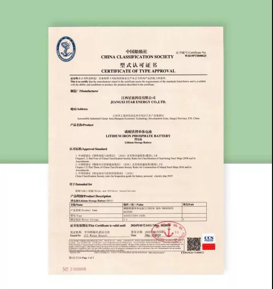 近日,江西星盈科技有限公司(以下簡(jiǎn)稱“星盈科技”)SLA45173184-150AH磷酸鐵鋰單體電芯獲得中國(guó)船級(jí)社(CCS)頒發(fā)的型式認(rèn)可證書,標(biāo)志著星盈科技拿到了進(jìn)軍電動(dòng)船舶市場(chǎng)的通行證。