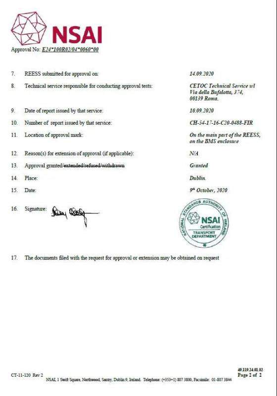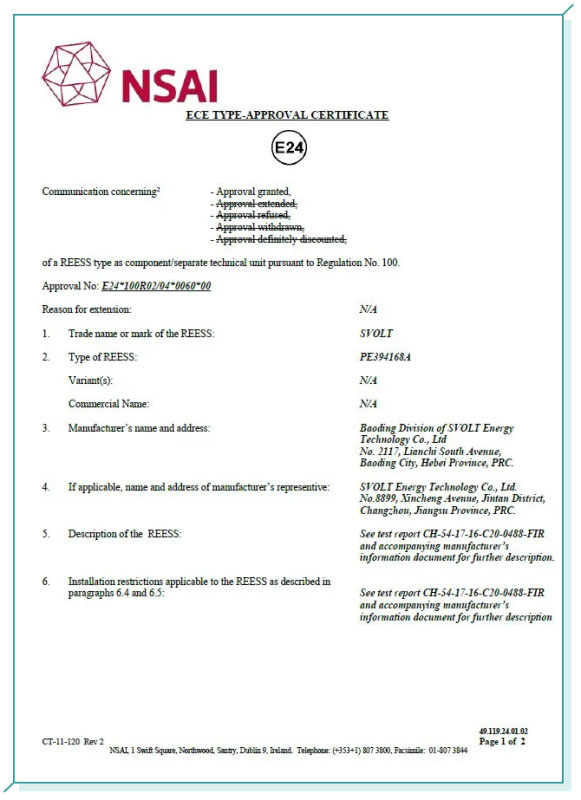 此次頒發(fā)的電池包E-Mark證書(shū)(E24)為愛(ài)爾蘭交通部授予,愛(ài)爾蘭交通部屬于歐洲經(jīng)濟(jì)委員會(huì)(Economic Commission for Europe, 簡(jiǎn)稱(chēng)ECE)成員國(guó)的政府部門(mén)。凡產(chǎn)品進(jìn)入歐洲市場(chǎng)前必須取得此認(rèn)證,并可以在所有成員國(guó)市場(chǎng)都能進(jìn)行銷(xiāo)售。