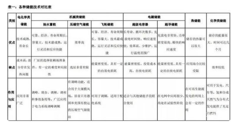 通過調(diào)研現(xiàn)有儲(chǔ)能項(xiàng)目并對(duì)各種儲(chǔ)能技術(shù)的對(duì)比分析,電化學(xué)類儲(chǔ)能在現(xiàn)階段應(yīng)用最為廣泛。詳見表一:各種儲(chǔ)能技術(shù)對(duì)比表。
