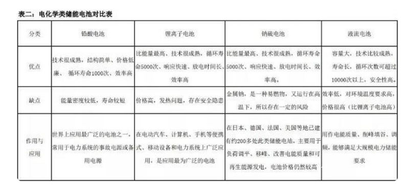 電化學(xué)類儲(chǔ)能中尤以鉛酸電池和鋰離子電池應(yīng)用最為廣泛。詳見表二:電化學(xué)類儲(chǔ)能電池對(duì)比表。