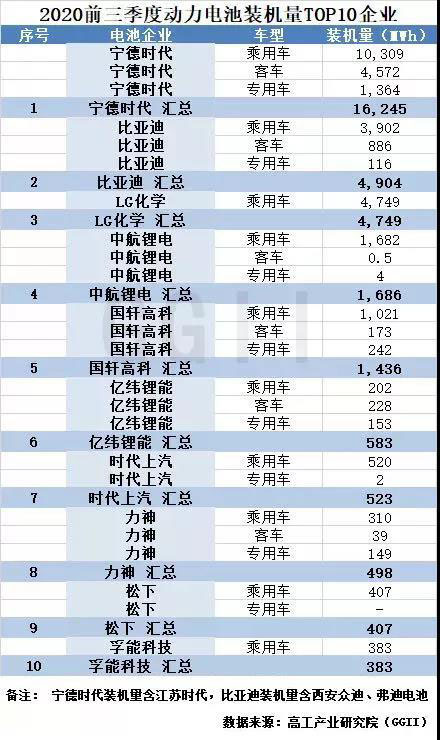 以下是高工鋰電梳理的2020年前三季度動力電池裝機量TOP10企業(yè)的整體情況: