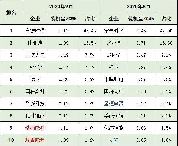 排名前十的企業(yè)分別是寧德時代、比亞迪、中航鋰電、LG化學、松下、國軒高科、孚能科技、億緯鋰能、瑞浦能源、蜂巢能源。