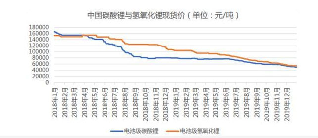 數(shù)據(jù)顯示,國內(nèi)電池級碳酸鋰售價從2018年初的17萬元/噸一路下滑,到2019年末時,已跌至5萬元/噸的水平。另一個主要產(chǎn)品氫氧化鋰價格走勢也基本一致。