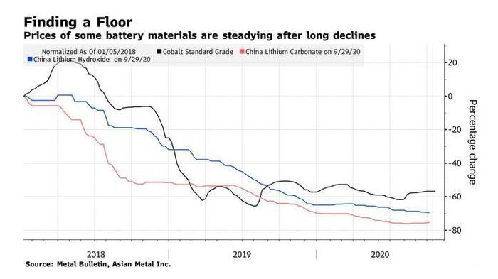 由于電池生產(chǎn)商爭相提供更多供應(yīng)量,鋰化學(xué)品的價(jià)格從2018年中期開始暴跌,遠(yuǎn)遠(yuǎn)超出了需求增長的幅度。近期研究報(bào)告顯示,盡管近幾個(gè)月來鋰化學(xué)品的體系水平僅為峰值的一半左右,但這些材料已經(jīng)趨于穩(wěn)定。