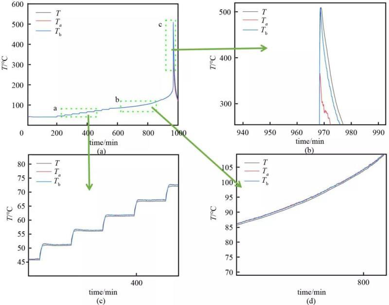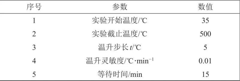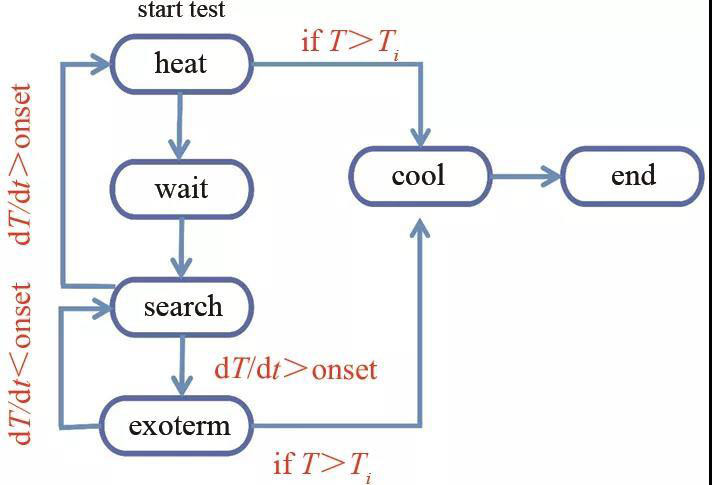 高溫絕熱熱失控的實(shí)驗(yàn)設(shè)備是英國赫爾有限公司生產(chǎn)的絕熱加速量熱儀(ARC)。ARC工作時(shí)采用“加熱(heat)-等待(wait)-搜尋(seak)”模式來探測樣品的放熱應(yīng),簡稱H-W-S模式。ARC從起始溫度開始對(duì)樣品進(jìn)行加熱,當(dāng)溫度升高一個(gè)步階后,系統(tǒng)轉(zhuǎn)入等待模式;等待模式是為了讓樣品、樣品容器和量熱腔三者達(dá)到熱平衡,使系統(tǒng)更精確的搜尋到樣品的自放熱反應(yīng);等待過程結(jié)束后,系統(tǒng)將自動(dòng)進(jìn)入搜尋模式,對(duì)樣品溫升速率進(jìn)行探測,如果搜尋到樣品的升溫速率大于系統(tǒng)所設(shè)置的靈敏度(例如0.01 ℃/min),則系統(tǒng)判定樣品出現(xiàn)自放熱,進(jìn)入絕熱模式,記錄自放熱速率,并始終保持量熱儀的溫度與樣品溫度同步,避免樣品熱散失,提供絕熱環(huán)境,追蹤樣品的放熱反應(yīng)。此時(shí)樣品溫度的升降只與自身的反應(yīng)有關(guān)。如果升溫速率小于 0.01 ℃/min,則ARC將以設(shè)定升溫步階繼續(xù)對(duì)樣品加熱,運(yùn)行H-W-S模式,直到在某個(gè)溫度下出現(xiàn)自放熱的情況或加熱達(dá)到終止溫度,ARC工作流程圖如圖5所示。