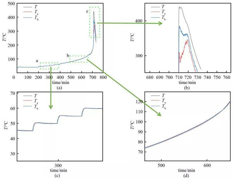 25% SOC電池?zé)崾Э剡^程中,電池正極極耳、負(fù)極極耳、電池中心三點(diǎn)溫度Tb、Ta、T變化見圖9,a階段為電池階梯升溫階段,電池正極極耳、負(fù)極極耳、電池中心三點(diǎn)溫度基本相等,說明使用的鋁箔能夠良好的傳導(dǎo)加熱絲的熱量,電池受熱均勻。b階段為電池自放熱升溫階段,電池正極、電池負(fù)極、電池中心三點(diǎn)溫度基本相等,最大溫差不超過2 ℃。熱失控達(dá)到最高溫度過程中,電池正極、負(fù)極的最高溫度分別為385.5 ℃、342.7 ℃,電池正極溫度大于負(fù)極。