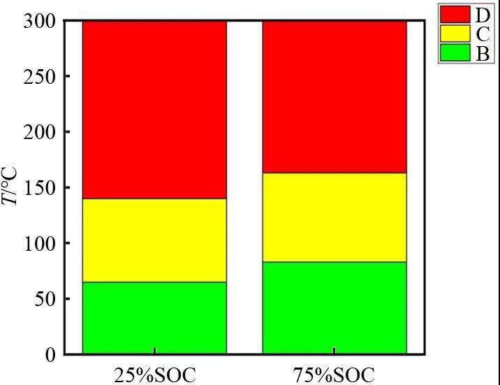 為了清晰的表明25% SOC、75% SOC兩種狀態(tài)下電池?zé)岚踩缘牟町?,將兩塊電池?zé)崾Э剡^程中的熱特性參數(shù)繪制成了柱狀圖,如圖8所示,綠色部分表示無自產(chǎn)熱區(qū)域,此區(qū)域內(nèi)鋰電池不存在發(fā)生熱失控的風(fēng)險(xiǎn),黃色部分表示自產(chǎn)熱區(qū)域,此區(qū)域內(nèi)鋰電池有發(fā)生熱失控的風(fēng)險(xiǎn),并且溫度越高,發(fā)生熱失控的概率越大,紅色部分為熱失控區(qū)域,鋰電池隨時(shí)存在起火、爆炸的危險(xiǎn)。通過對(duì)比無自產(chǎn)熱和熱失控區(qū)域的綠色和紅色區(qū)域的面積就可以直觀的對(duì)比電池的熱穩(wěn)定性和熱安全性。75% SOC電池相較于25% SOC電池的自產(chǎn)熱起始溫度T0高17.73 ℃,T0主要受SEI膜分解的影響,與電池正負(fù)極材料的熱穩(wěn)定性相關(guān)不大,故其不受電池荷電狀態(tài)的影響;25% SOC電池相較于75% SOC電池的熱失控觸發(fā)溫度低22.68 ℃,即75% SOC電池發(fā)生熱失控的臨界點(diǎn)相較于25% SOC電池低,不易發(fā)生熱失控。這是和以前的研究結(jié)果是不同的,我們會(huì)進(jìn)行進(jìn)一步的研究以發(fā)掘其內(nèi)在影響因素。75% SOC電池相較于25% SOC電池?zé)崾Э氐淖罡邷囟萒m高70.07 ℃,最大溫升速率達(dá)111.37 ℃/min,即75% SOC電池?zé)崾Э剡^程化學(xué)反應(yīng)放熱更加劇烈,熱失控破壞性較大。25% SOC、75% SOC電池?zé)崾Э剡^程中的減重比分別為20.67%、31.78%,75% SOC電池?zé)崾Э叵牡糨^多的材料,印證該過程化學(xué)反應(yīng)更加劇烈。
