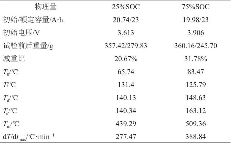 表2 25%SOC、75%SOC電池?zé)崾Э靥卣鲄?shù)匯總