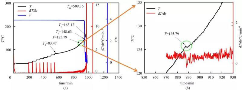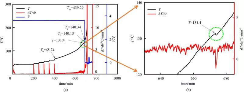 試驗(yàn)得到軟包NCM523電池25% SOC下電池溫度、電壓、溫升速率變化過程,見圖6(a),電池在ARC腔體中被加熱到64.74 ℃時(shí),系統(tǒng)檢測到電池的溫升速率恒大于0.03 ℃/min,定義電池內(nèi)部存在自產(chǎn)熱,這是由于SEI膜在高溫下發(fā)生分解導(dǎo)致,此時(shí)電池自放熱的起始溫度T0為64.74 ℃。隨著電池溫度的升高,電池電壓從3.581 V驟降至0 V附近,這是由于電池的溫度到達(dá)了隔膜的熔點(diǎn),隔膜出現(xiàn)熔斷點(diǎn)導(dǎo)致正負(fù)極接觸發(fā)生局部微短路,此時(shí)電池隔膜熔斷點(diǎn)的溫度Td為140.13 ℃。此后電池電壓在0 V附近上下波動(dòng)一段時(shí)間恒定為0 V,這是電池隔膜完全熔融的過程。電池正負(fù)極發(fā)生短路以后放出大量的熱,電池溫升速率dT/dt明顯變大。當(dāng)電池溫升速率dT/dt連續(xù)大于1 ℃/min時(shí),電池溫度呈指數(shù)式上升,此時(shí)為電池?zé)崾Э氐挠|發(fā)溫度Tc,Tc為140.34 ℃。熱失控的觸發(fā)是由于鋰電池內(nèi)部正極材料與電解液發(fā)生的反應(yīng)使電池溫度升高導(dǎo)致。此后電池發(fā)生熱失控,熱失控過程中電池所達(dá)到的最高溫度Tm為439.29 ℃,最大的溫升速率dT/dtmax為277.47 ℃/min。熱失控過程中參數(shù)dT/dtmax物理意義為每分鐘溫度增長的大小,可以一定程度表征爆炸的劇烈程度。75% SOC的電池發(fā)生熱失控的過程見圖7(a),熱失控起始溫度T0為83.47 ℃,電池隔膜熔斷的溫度Td為148.63 ℃,電池?zé)崾Э赜|發(fā)溫度Tc為163.12 ℃,電池?zé)崾Э刈罡邷囟萒m為509.36 ℃,最大的溫升速率dT/dtmax為388.84 ℃/min。