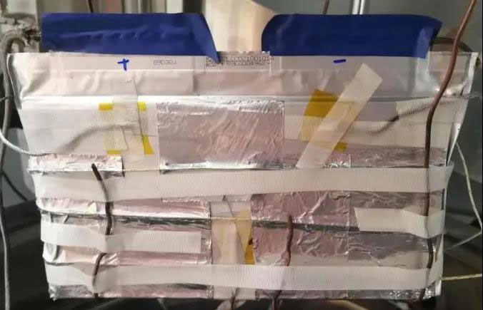 為得到試驗(yàn)過程中電池的溫度場分布,在圖3所示位置中,正、負(fù)極處布置溫度傳感器1、2,電池中心位置兩面布置溫度傳感器a、b,a、b溫度傳感器平均值為電池中心處的溫度。將加熱絲沿電池長度方向纏繞3圈,然后在電池表面纏繞一圈鋁箔紙,以保證電池表面與加熱絲同步升溫。準(zhǔn)備工作完成的電池如圖4所示。