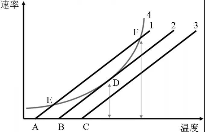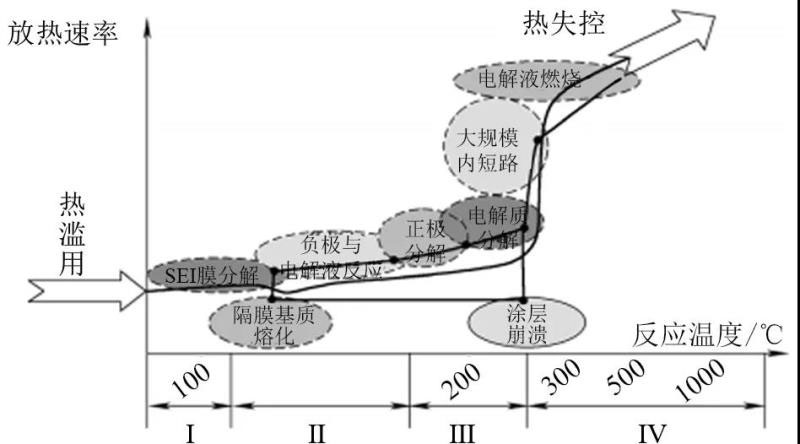 電池的Semenov示意圖如圖1所示,曲線1、2、3表示不同的散熱條件,曲線4表示電池總產(chǎn)熱量。其中E、F為穩(wěn)定點(diǎn),曲線4與直線2相切于點(diǎn)D,為不穩(wěn)定點(diǎn)。當(dāng)電池散熱曲線在臨界散熱曲線2左邊時(shí),電池會(huì)在穩(wěn)定的溫度下正常工作;當(dāng)電池在其右邊時(shí),由于生熱速率大于散熱速率,電池溫度會(huì)持續(xù)升高,發(fā)生熱失控。鋰離子電池?zé)釣E用泄氣和燃燒的過程可以概括為如下階段:SEI膜分解、隔膜熔化、正極分解、負(fù)極嵌鋰氧化電解液、電池內(nèi)短路、電解液熱解、電解液燃燒等,熱失控演變過程如圖2所示。Richard等提出 SEI 膜分解可能的反應(yīng)為