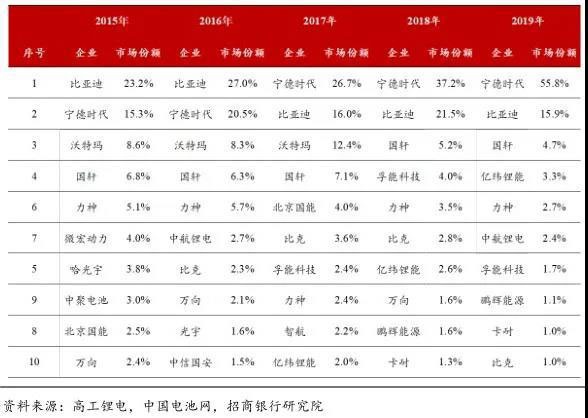 過去5年中國動力電池企業(yè)出貨量市場份額
