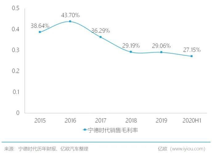 這是其毛利率逐年下降的路徑選擇結(jié)果。隨著新能源車補貼政策逐漸退坡調(diào)整,整車企業(yè)在追求更高續(xù)航里程的同時,降低電池成本的訴求日益明顯。自2016年起,寧德時代等國內(nèi)主要動力電池企業(yè)的毛利率直線下降,由最初的近45%滑落至30%左右。而2020年上半年,寧德時代的銷售毛利率僅為27.15%,呈繼續(xù)下滑的態(tài)勢。