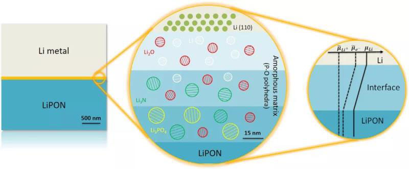 圖6.Li/LiPON多層界面原理圖。uLi+、ue-,和uLi分別表示鋰離子的電化學(xué)電位、電子的電化學(xué)電位和鋰的化學(xué)勢(shì)。