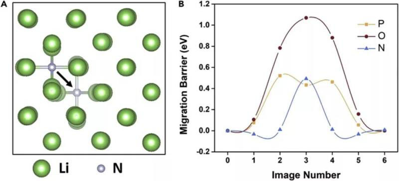圖5.間隙擴(kuò)散。(A,B)分解的LiPON組分可能通過間隙擴(kuò)散(A)的示意圖和過渡態(tài)計(jì)算表明鋰金屬中P、O和N的擴(kuò)散勢(shì)壘。