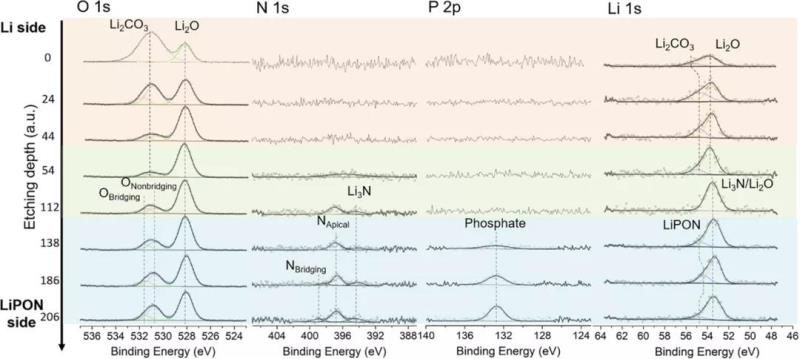 圖4.使用XPS分析了O 1s、N 1s、P 2p和Li 1s沿Li/LiPON界面的化學(xué)演化
