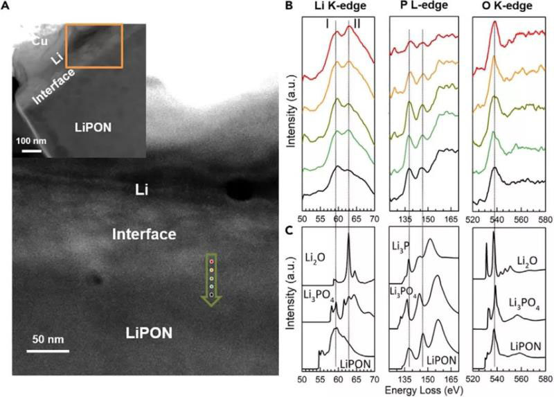 為了進(jìn)一步研究Li/LiPON界面的化學(xué)演化,進(jìn)行了Cryo-STEM-EELS圖譜分析。同時(shí)使用FEFF9軟件模擬了Li2O、Li3PO4、Li3P和LiPON對(duì)應(yīng)邊緣的EELS光譜,其非晶態(tài)LiPON結(jié)構(gòu)由分子動(dòng)力學(xué)模擬(AIMD)生成。在LiPON區(qū)域(圖3B中的黑色光譜)中,實(shí)驗(yàn)測(cè)量的Li K-edge, P L-edge和O K-edge的EELS光譜與圖3C中LiPON對(duì)應(yīng)的模擬EELS光譜一致。當(dāng)從界面向LiPON區(qū)域移動(dòng)時(shí),實(shí)驗(yàn)中Li K-edge光譜中的兩個(gè)主峰(峰I為L(zhǎng)iPON,峰II為L(zhǎng)i2O)的強(qiáng)度比增加,表明Li2O和LiPON都對(duì)K-edge有貢獻(xiàn),Li2O的貢獻(xiàn)隨著靠近LiPON區(qū)域而減小。