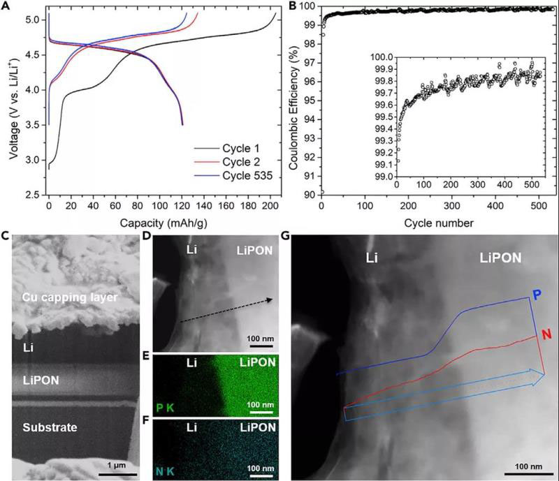 圖1.Li/LiPON/LNMO全電池電化學(xué)性能和Cryo-STEM EDS結(jié)果。(A)第1、第2和535圈循環(huán)的電壓曲線;(B)循環(huán)500圈的庫(kù)倫效率;(C)Li/LiPON界面的Cryo-FIB-SEM橫截面圖像;(D)Li/LiPON界面Cryo-STEM暗場(chǎng)圖像;(E,F(xiàn))磷和氮在Li/LiPON界面的EDS映射;(G)磷和氮元素沿D圖中的黑色虛線的EDS線掃。