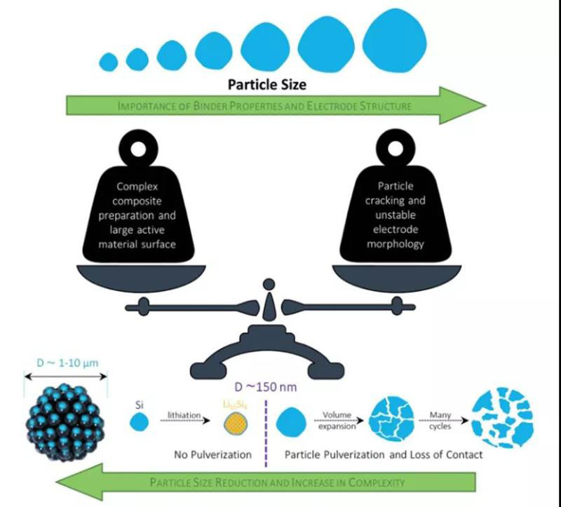 圖9 硅活性材料粒徑減小的優(yōu)點(diǎn)與隨之而來的挑戰(zhàn)之間的權(quán)衡關(guān)系的示意圖