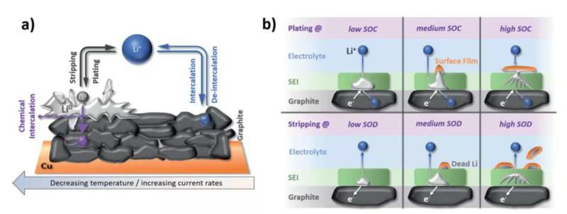 鋰離子電池中石墨負(fù)極的主要挑戰(zhàn)之一是有限的倍率,尤其是鋰化過程,即全電池的充電,以及在電極表面上沉積鋰帶來的相關(guān)風(fēng)險(xiǎn),可能導(dǎo)致容量迅速衰減、電池短路以及更嚴(yán)重的熱失控。石墨的倍率性能盡管尚未被完全理解,潛在貢獻(xiàn)源于復(fù)雜相互作用。包括粒徑和形態(tài),電極結(jié)構(gòu),發(fā)生的相變,化學(xué)性質(zhì)和組成, SEI及相應(yīng)的電解質(zhì)組成,鋰離子去溶劑化過程。很大程度上取決于鋰離子嵌入脫出時(shí)的阻力,形成穩(wěn)定的利于離子擴(kuò)散的層間結(jié)構(gòu)。