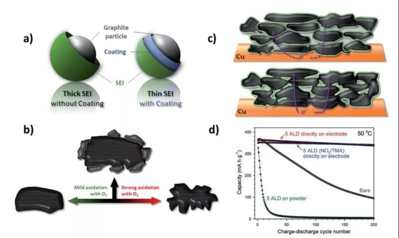 除了較差的倍率性能外,LIB中石墨負(fù)極的另一個(gè)缺點(diǎn)是由于還原性電解質(zhì)的分解導(dǎo)致第一循環(huán)不可逆容量損失。商業(yè)化策略一直采用表面改性修飾石墨顆粒的表面,這種可以通過使用氧化溶液,陶瓷材料或氣體對石墨顆粒進(jìn)行處理,隨后進(jìn)行熱處理改變基面和邊緣平面以增強(qiáng)電化學(xué)性能?,F(xiàn)有的策略包括在表面形成合金,金屬氧化物,氟化物和有機(jī)無機(jī)鹽。這種方法的操作難度大,引入修飾層的厚度和質(zhì)量需要得到精準(zhǔn)的控制。另一種方法依賴于引入少量電解質(zhì)添加劑,該電解質(zhì)添加劑在動(dòng)力學(xué)上更有效地促進(jìn)了SEI的形成,因此可以提高初始庫侖效率,但電解液的配制幾乎是所有商家的機(jī)密。