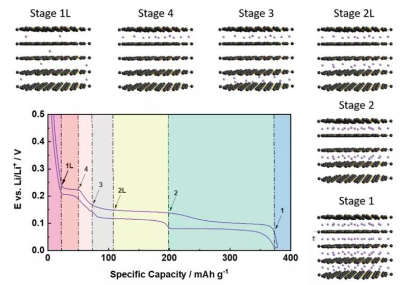 鋰離子在石墨中脫/嵌過程基本上遵循Yazami和Touzain提出的主客體通用機(jī)制,其中階段1為鋰離子嵌入的最終階段,即形成LiC6的總體化學(xué)計(jì)量化合物,帶來372 mAh/g和850 mAh/cm3的理論容量。伴隨大量Li的嵌入,單個(gè)石墨烯層彼此之間略有滑動(dòng),導(dǎo)致從原始石墨中的ABABA堆疊到AIAIA堆疊的對稱變化。處于完全鋰化狀態(tài)時(shí),層間距離適度增加了約10.4%,即從無鋰石墨的3.35?增加到LiC6的3.70?。