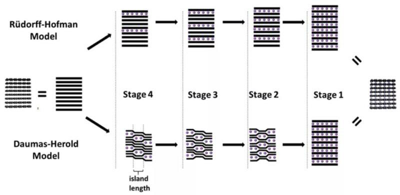 兩種嵌入模型:Rüdorff和Hofmann提出的濃度依賴性分級(jí)機(jī)制的Rüdorff-Hofmann model, Daumas和Herold提出的離域式島狀Daumas-Herold model。盡管基于現(xiàn)有的光譜和電子學(xué)技術(shù)的發(fā)展,一些研究較為支持Daumas-Herold model,但這兩種模型對廣譜性石墨顆粒的嵌鋰行為仍有待考證。