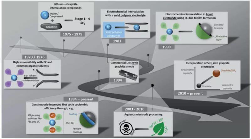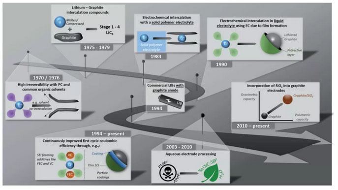圖1. 鋰離子電池石墨負(fù)極發(fā)展的主要里程碑摘要
