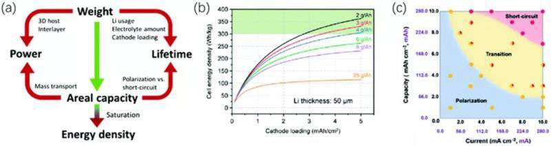 圖8.(a)實(shí)用的鋰金屬電池的各個(gè)方面的關(guān)系(b)50μm的鋰箔負(fù)極8層陰極的袋裝電池在各種負(fù)載和電解質(zhì)含量下的電池能量密度(c)鋰金屬負(fù)極在不同工作條件下的電化學(xué)圖