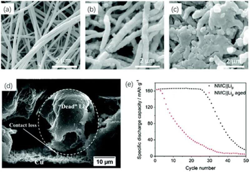 圖6.(a-c)經(jīng)過0、10、30個(gè)循環(huán)后SEI在支架上積累的SEM圖像,可以看到,30周循環(huán)后(c)的支架直徑和形態(tài)由于SEI層的積累發(fā)生了變化,這一過程同時(shí)會(huì)導(dǎo)致電解質(zhì)和鋰的雙重消耗(d)鋰顆粒被腐蝕的SEM圖像(e)原始鋰粉負(fù)極的完整電池的循環(huán)性能和老化一周的電池的循環(huán)性能對比