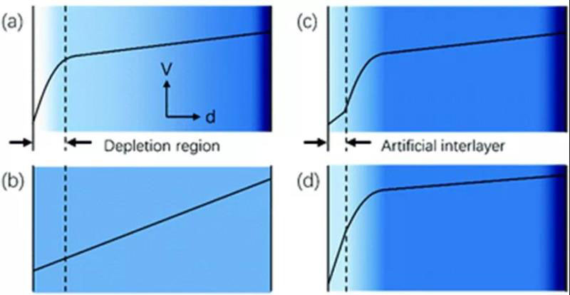 圖3. 不同情況下的電解質(zhì)中的電壓曲線:(a)普通的電解液(b)理想的電解質(zhì)(c)理想人工SEI層+電解液(d)非理想人工SEI層+電解液。顏色差別代表了鋰離子的濃度差別